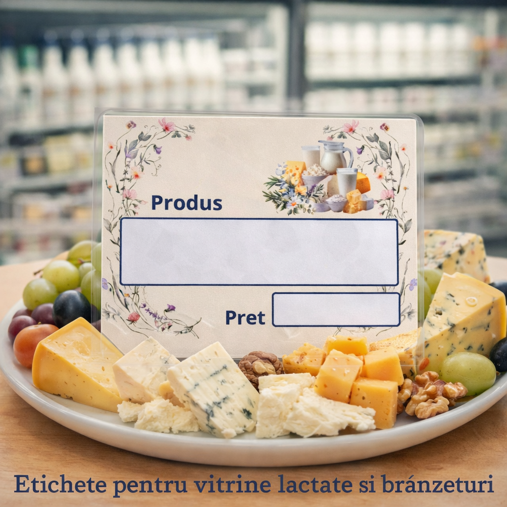 Etichetele de preț pentru vitrine de lactate și brânzeturi sunt ideale pentru prezentarea clară și elegantă a produselor în magazine alimentare, vitrine frigorifice și băcănii. Sunt vizibile, rezistente și oferă un aspect îngrijit și profesionist vitrinei tale.